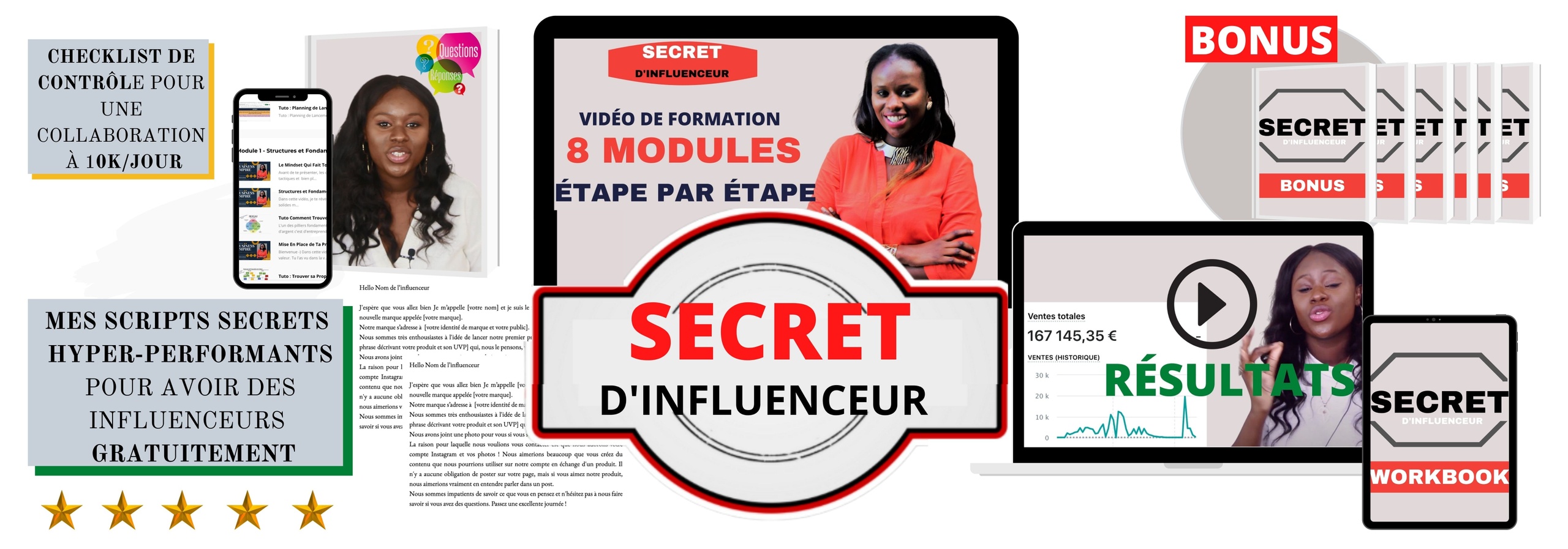 Ne vous inquiétez pas, Secret d’influenceur est une formation complète sur la collaboration avec les influenceurs pour vous aider à augmenter vos ventes et développer votre entreprise.