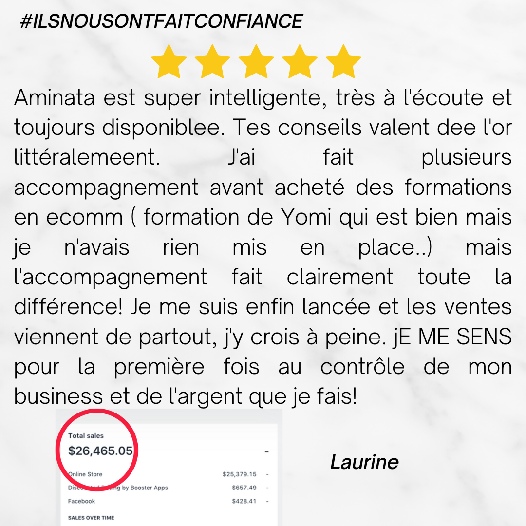 Bonjour Je suis Aminata NDIAYE, e-commerçante depuis 2015, spécialiste e-commerce formatrice en entrepreneuriat, au digital et fondatrice de WeImpact. En 2016, j'ai quitté la France pour vendre les bijoux des femmes sud-africaines. C'est comme cela que mon aventure entrepreneuriale a commencé. Ma marque a généré la première année plus de 300 000 euros. Installée alors en Afrique du Sud, j'ai aidé de nombreux entrepreneurs à lancer leur business et à vivre leur rêve, eux aussi. Et depuis mon retour en France, j' ai aidé des centaines de porteurs de projets dans le lancement et le développement de leur marque e-commerce et de leur business. Ma marque est présente dans de nombreux points de vente physique et j'ai pu lancer 2 autres marques avec des amis entrepreneurs. L'une de mes plus grandes joies c'est d'aider d'autres femmes et hommes à faire la même chose et à vivre de leur business. Je célèbre toutes les réussites de mes apprenants, de la plus petite victoire (par ex: trouver une idée de produit qui leur tient à coeur ou leur première vente) à la plus grande ( générer des milliers d'euros de chiffre d'affaire par jour ou encore avoir ses produits dans des grandes enseignes). Mais tout cela commence par une chose : l'apprentissage des bons outils mais surtout sa mise en pratique!